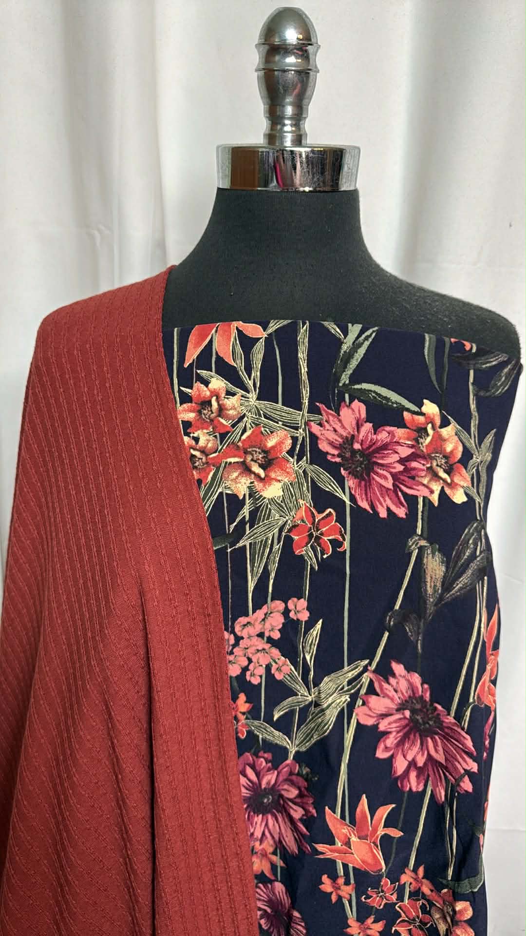 3YD Millennium: Vertical Stretch Woven (75% Rayon/20% Nylon/5% Spandex - Fabric has been rotated to have stretch around mannequin) & 1YD+ 6" Fancy Rib Knit