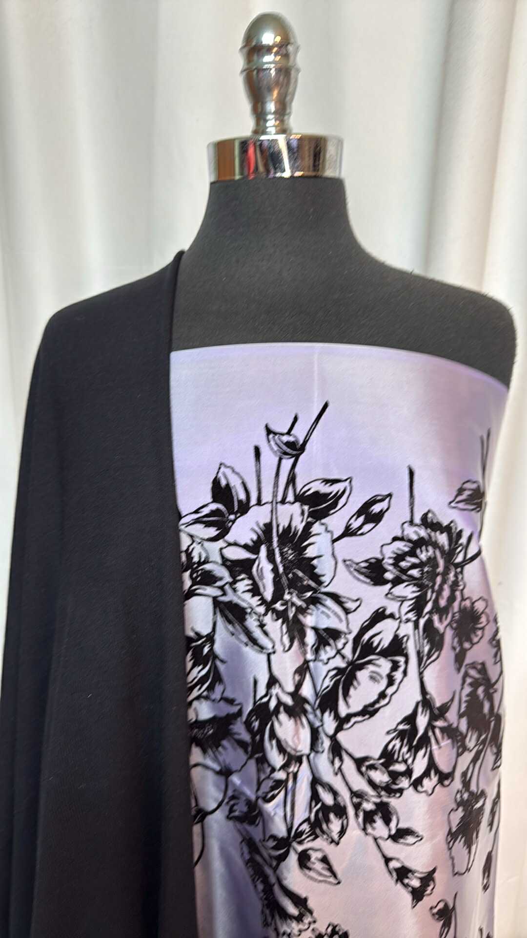 BLACK/PURPLE FLORAL BORDER BUNDLE : 2YD Purple Floral Single-Border Flocked Poly Woven & 1YD Black Modal Rib : A28817